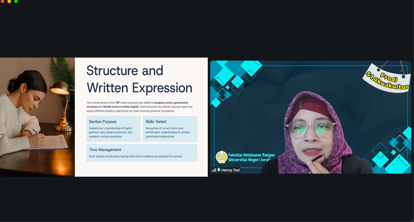 Program Studi S1 Akuakultur FKP Unesa memiliki komitmen untuk menghasilkan lulusan yang kompetitif, adaptif, dan siap bersaing di tingkat global. Oleh karena itu, peningkatan kemampuan Bahasa Inggris mahasiswa menjadi salah satu prioritas dalam pengembangan soft skills. Salah satu upaya strategis yang dilakukan adalah melalui penyelenggaraan Guest Lecture dengan tema “Structure and Written Expression in Test of English Proficiency”.